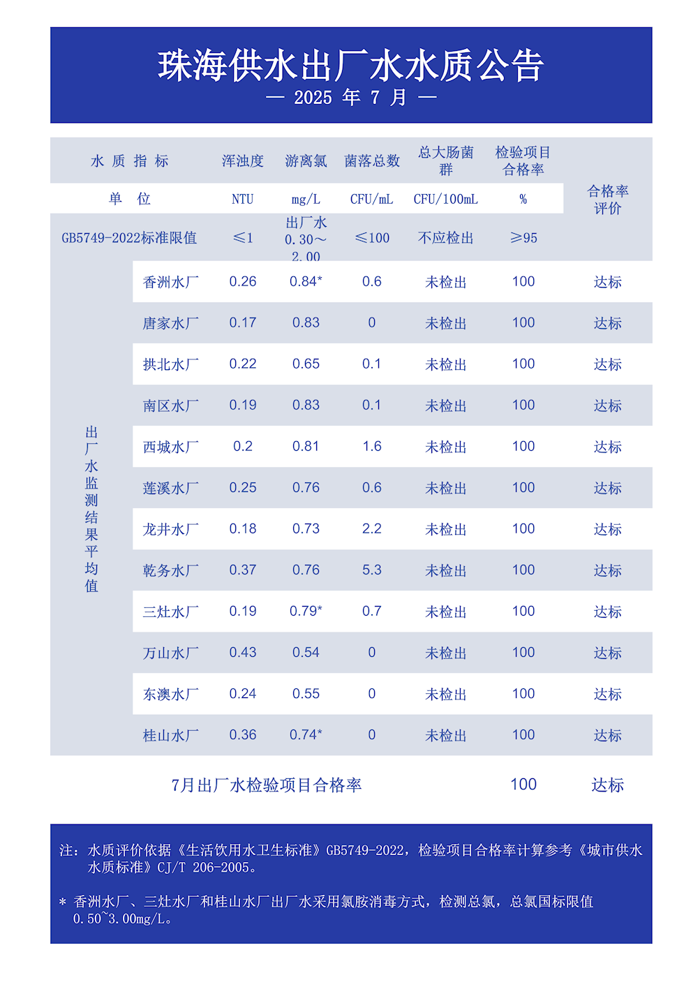2025年7月珠海供水出厂水水质公告