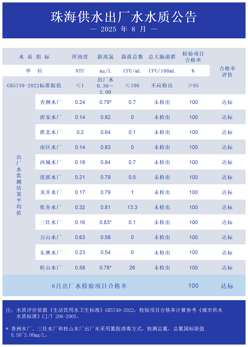2025年8月珠海供水出厂水水质公告